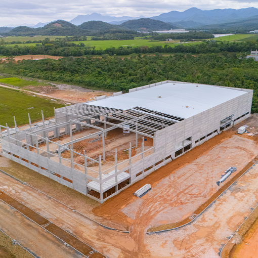 Além da resistência estrutural, a obra Kasulke também se destaca pela eficiência e agilidade da construção em pré-moldados. Todas as paredes foram fechadas com placas pré-moldadas e painéis de ventilação, otimizando o tempo de execução e garantindo um ambiente adequado para o armazenamento e manuseio dos produtos.